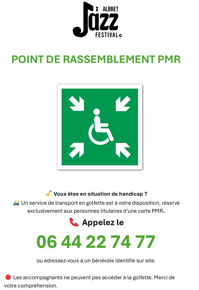 Le point de regroupement des personnes en situation de handicap est situé à l'accueil de la billetterie côté kiosque. Vous pouvez être déposé en voiture jusqu'à ce point puis une voiturette peut vous véhiculer jusqu'aux scènes du festival. Le retour peut être effectué de la même manière. Un numéro de téléphone sera spécialement prévu à cet effet.
